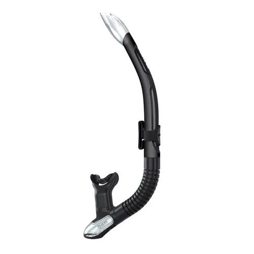 Anti-splash, félszáraz tetejű kivezető szeleppel, ergonómiai kialakítású szilikon csutorás sznorkel.